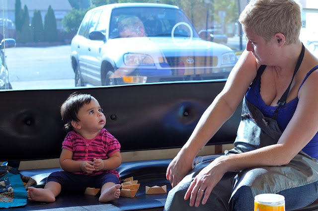 Just before your birthday we took you to Tamara at Boomerang to get your first haircut. It was pretty tame... Your hair wasn't that long but the texture kind of changed all at once and it was hanging in your face down your nose, making it difficult for you to see when you are crawling. It was quick. You stood at the couch and she went... snip, snip, snip... and it was all over! And you looked cute and I could see your sweetie pie face. There were a few barely there wisps to put in two plastic bags, one for us and one for WW.